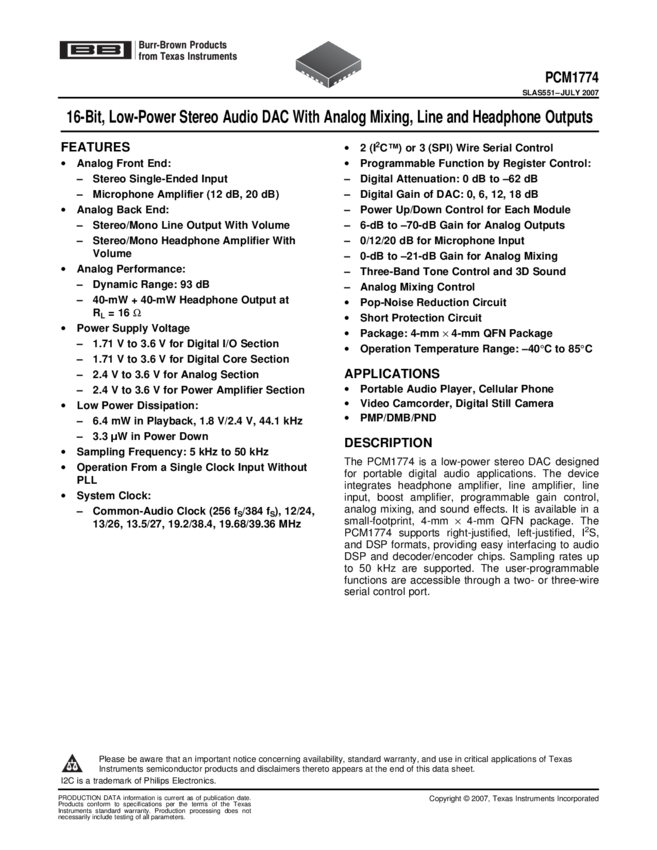 PCM1774RGPT DAC 2-CH Delta-Sigma 16-bit 20-Pin VQFN EP T/R