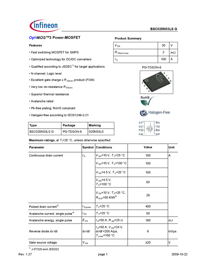 BSC020N03LS=SM1 Trans MOSFET N-CH 30V 28A 8-Pin TDSON