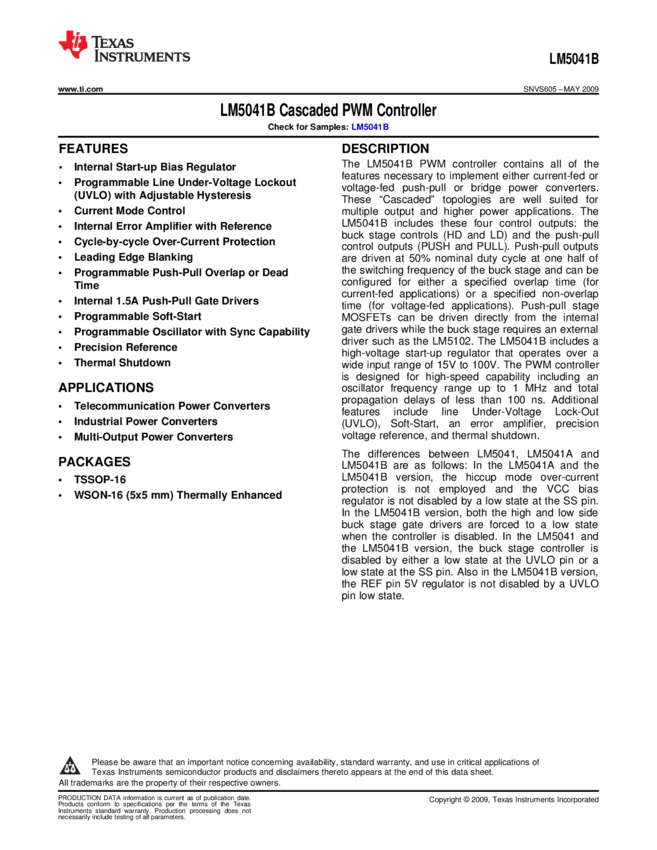LM5041BMTCX/NOPB Current Mode PWM Controller 25mA 16-Pin TSSOP T/R