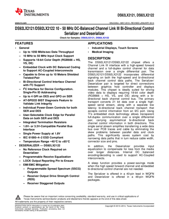 DS92LX2121SQE/NOPB Channel Link Serializer and Deserializer 40-Pin LLP EP T/R