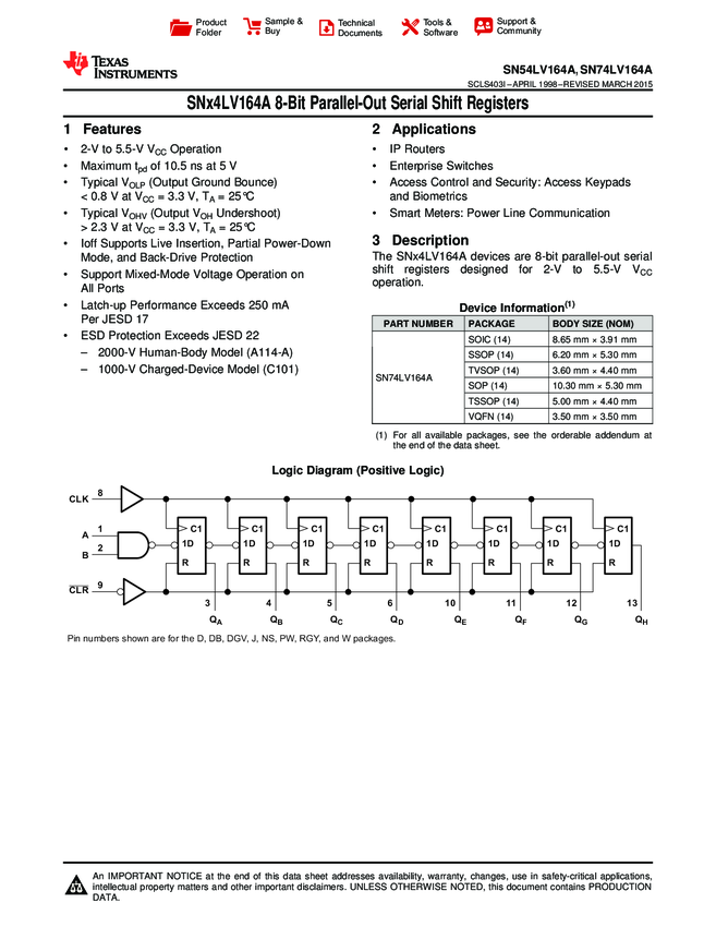 SN74LV164APW Shift Register Single 8-Bit Serial to Parallel 14-Pin TSSOP Tube