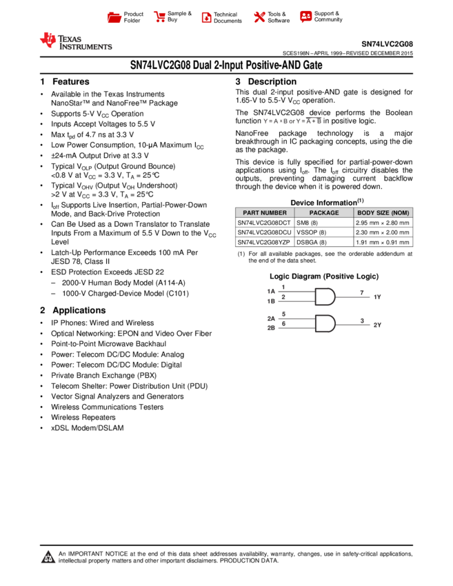 SN74LVC2G08YZPR AND Gate 2-Element 2-IN CMOS 8-Pin DSBGA T/R