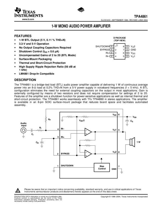 TPA4861D Audio Amp Speaker 1-CH Mono 1.1W Class-AB 8-Pin SOIC Tube