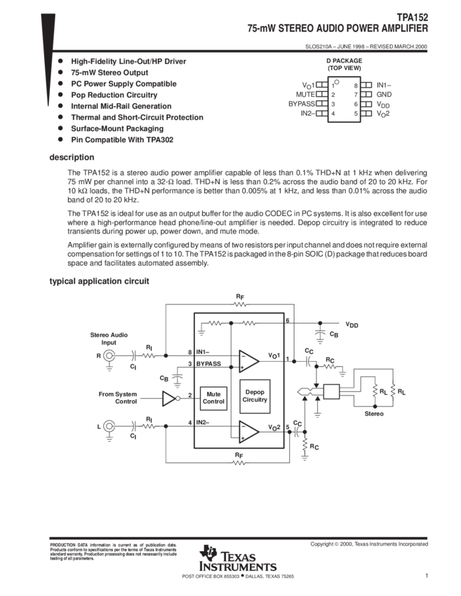 TPA152DR Audio Amp Headphone 2-CH Stereo 0.075W Class-AB 8-Pin SOIC T/R