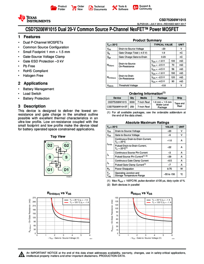 CSD75208W1015T Trans MOSFET P-CH 20V 1.6A 6-Pin DSBGA T/R