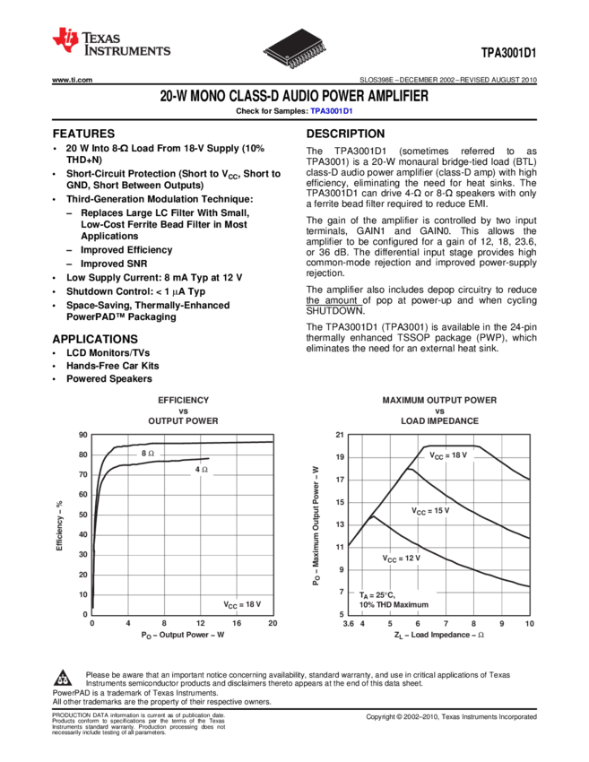 TPA3001D1PWPR Audio Amp Speaker 1-CH Mono 20W Class-D 24-Pin HTSSOP EP T/R