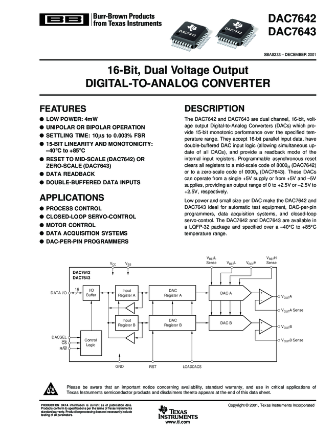 DAC7642VFBT DAC 2-CH R-2R 16-bit 32-Pin LQFP T/R