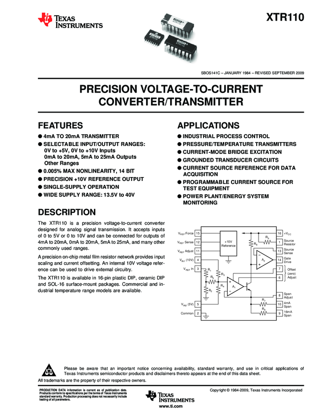 XTR110BG Voltage to Current Converter 16-Pin SBCDIP Tube