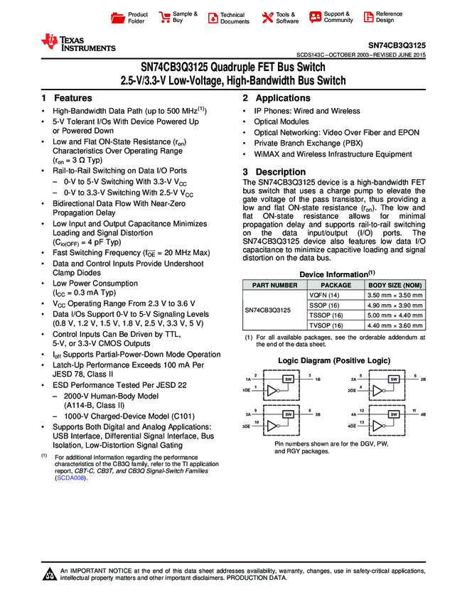 SN74CB3Q3125RGYR Bus Switch 4-Element CMOS 4-IN 14-Pin VQFN EP T/R