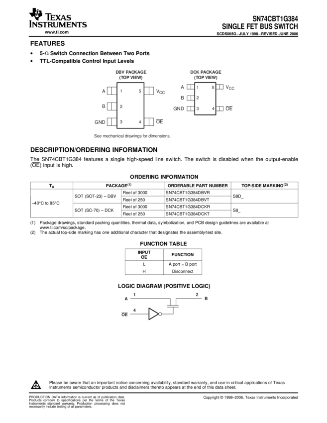 SN74CBT1G384DCKT Bus Switch 1-Element CMOS 1-IN 5-Pin SC-70 T/R