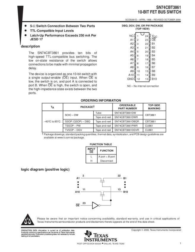 SN74CBT3861DBQR Bus Switch 1-Element CMOS 10-IN 24-Pin SSOP T/R