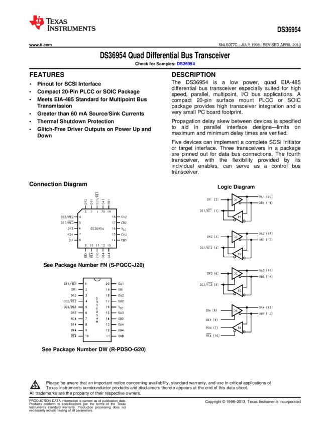 DS36954VX Quad Transmitter/Receiver RS-485 20-Pin PLCC T/R