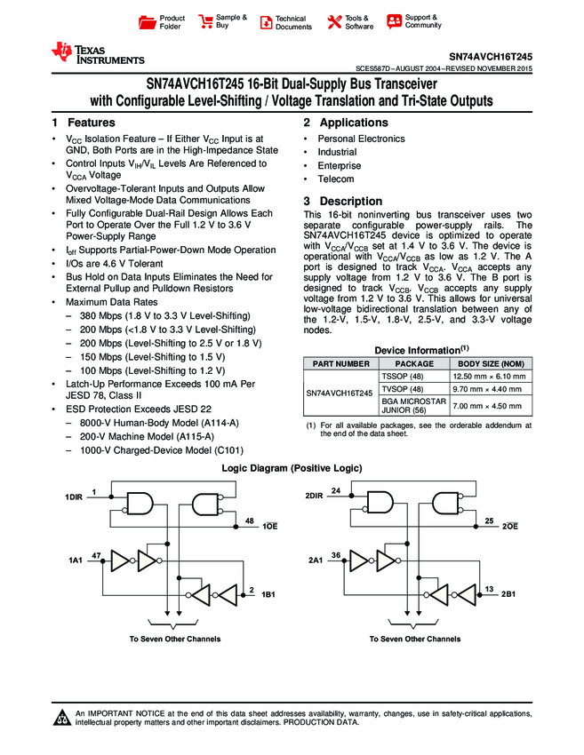 74AVCH16T245ZQLR Bus XCVR Dual 16-CH 3-ST 48-Pin TSSOP T/R