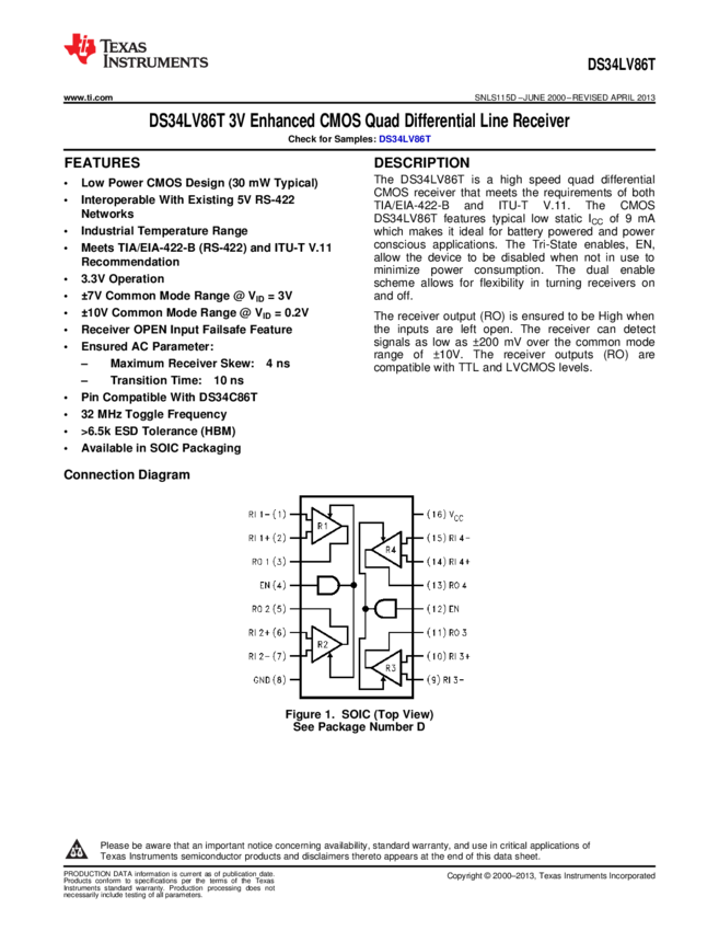DS34LV86TMX/NOPB Quad Receiver RS-422 16-Pin SOIC N T/R
