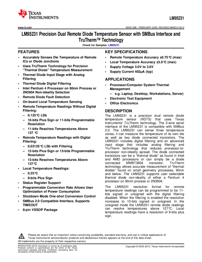 LM95231CIMM-1/NOPB Temp Sensor Digital Serial (2-Wire) 8-Pin MSOP T/R