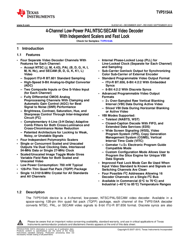 TVP5154AIPNPR Video Decoder 4ADC 9-Bit 128-Pin HTQFP EP T/R