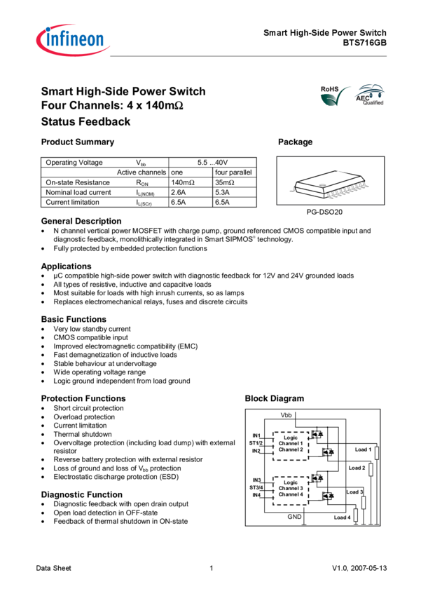 BTS716GB Power Switch Hi Side 2.3A 20-Pin DSO T/R