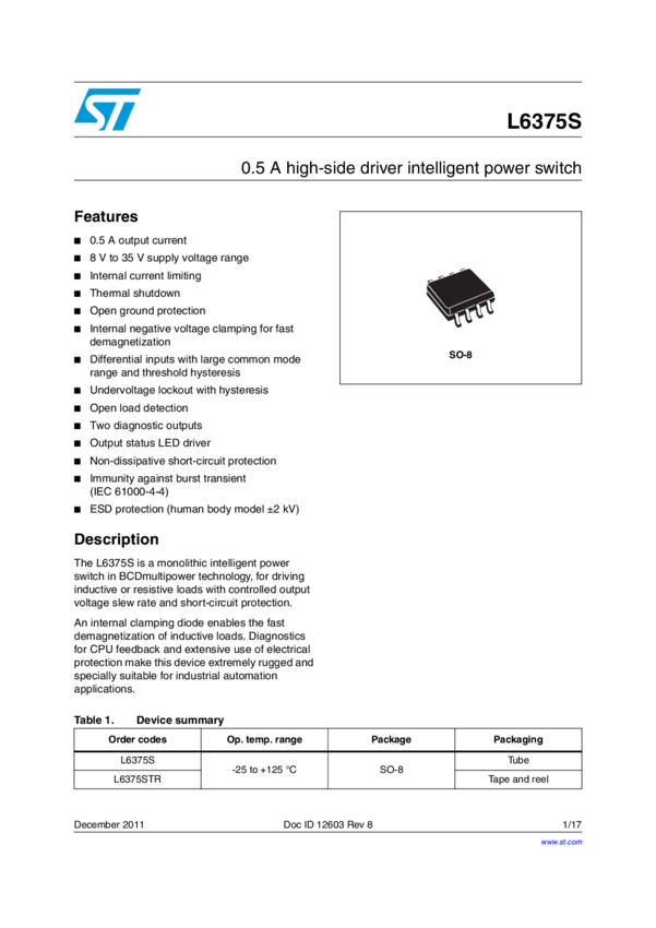 L6375STR Power Switch Hi Side 0.5A 8-Pin SO N T/R