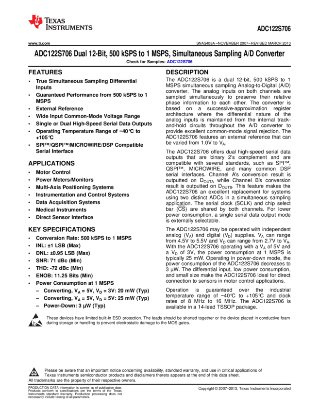 ADC122S706CIMTX/NOPB ADC Dual SAR 1Msps 12-bit Serial 14-Pin TSSOP T/R