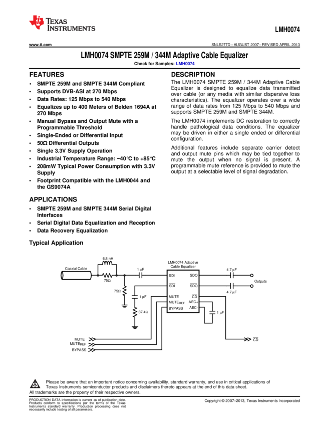 LMH0074SQX/NOPB Adaptive Cable Equalizer 16-Pin LLP EP T/R