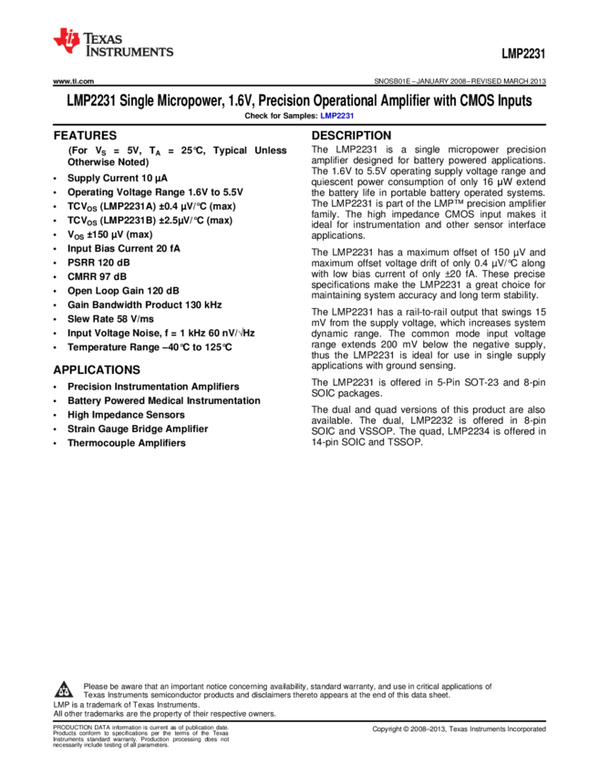 LMP2231BMF/NOPB OP Amp Single GP R-R O/P 5.5V 5-Pin SOT-23 T/R