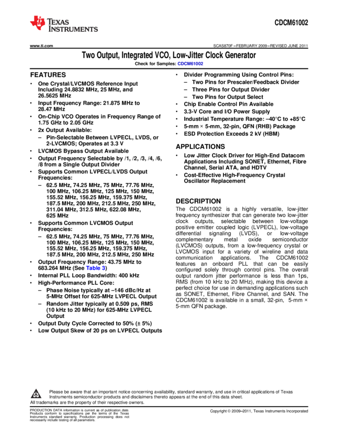 CDCM61002RHBT PLL Frequency Synthesizer Single 43.75MHz to 683.28MHz 32-Pin VQFN EP T/R
