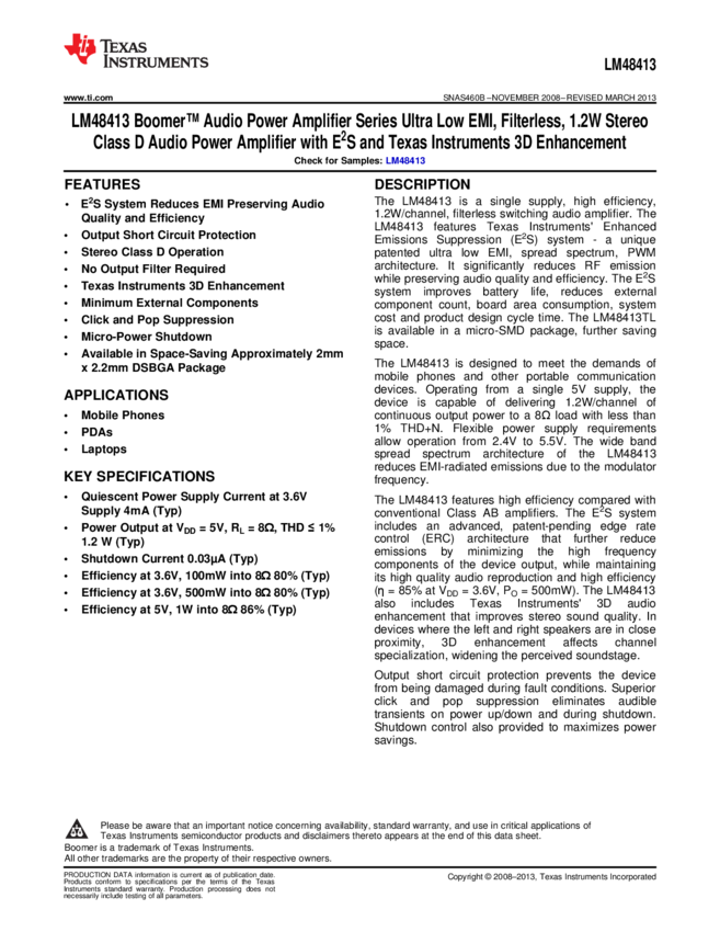 LM48413TL/NOPB Audio Amp Speaker 2-CH Stereo 1.5W Class-D 18-Pin uSMD T/R
