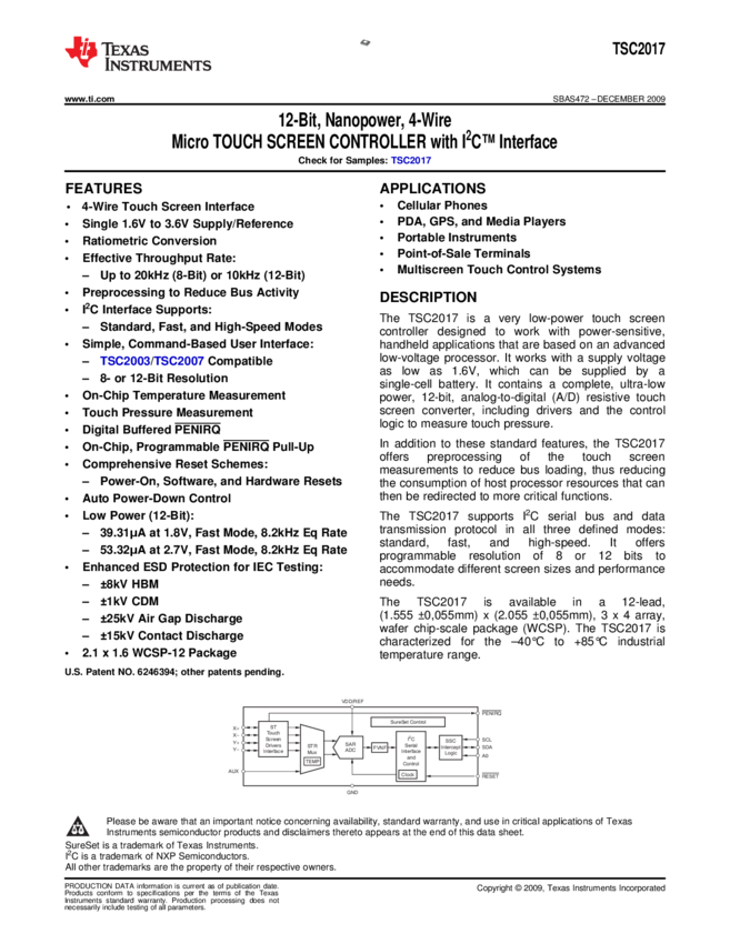 TSC2017IYZGT Touch Screen Controller 12-Pin DS-BGA T/R
