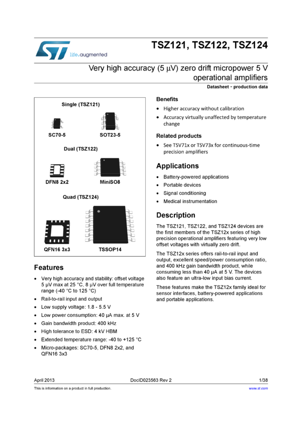 TSZ124IPT/TH High accuracy (5 µV) zero drift micropower 5 V op amp