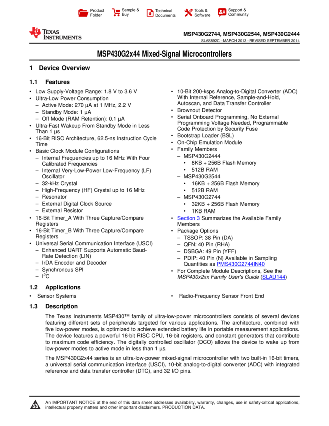MSP430G2744IDA38R MCU 16-bit MSP430 RISC 32KB Flash 2.5/3.3V 40-Pin VQFN T/R