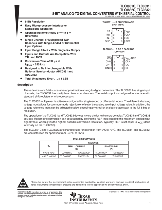TLC0832CDR ADC Single SAR 22ksps 8-bit Serial 8-Pin SOIC T/R