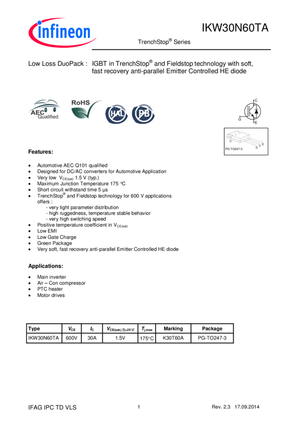 IKW30N60TAFKSA1 Trans IGBT Chip N-CH 600V 60A 3-Pin TO-247 Tube