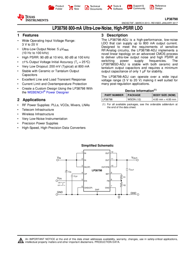 LP38798SD-ADJ/NOPB LDO Regulator Pos 1.2V to 11.8V 0.8A 12-Pin WSON T/R