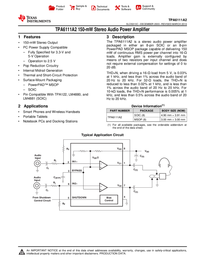 TPA6111A2DGN Audio Amp Headphone 2-CH Stereo 0.15W Class-AB 8-Pin HTSSOP EP Tube