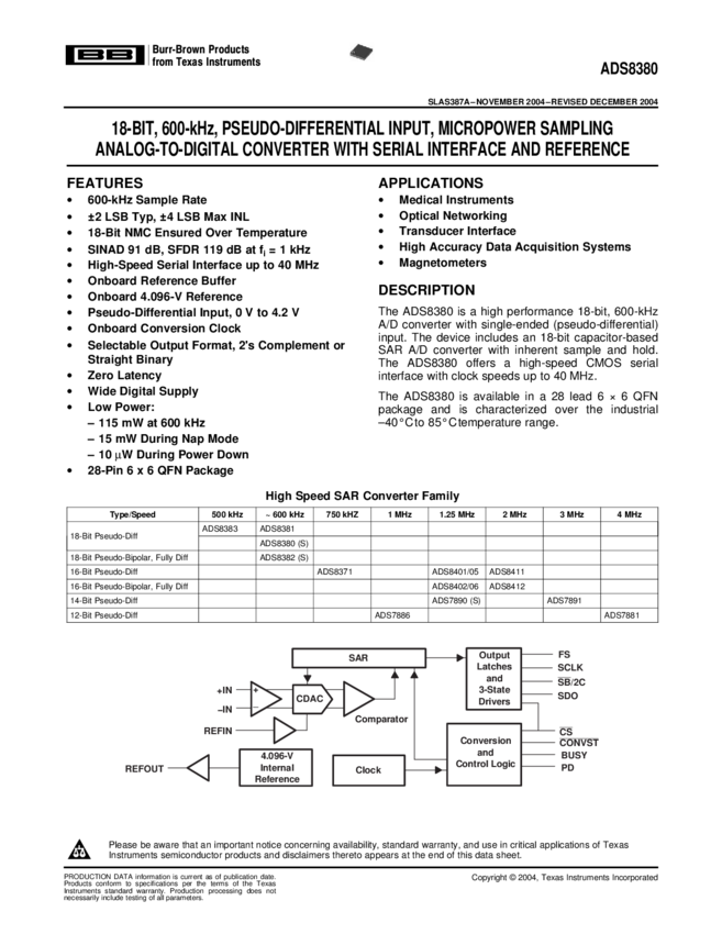ADS8380IBRHPR ADC Single SAR 600ksps 18-bit Serial 28-Pin VQFN EP T/R