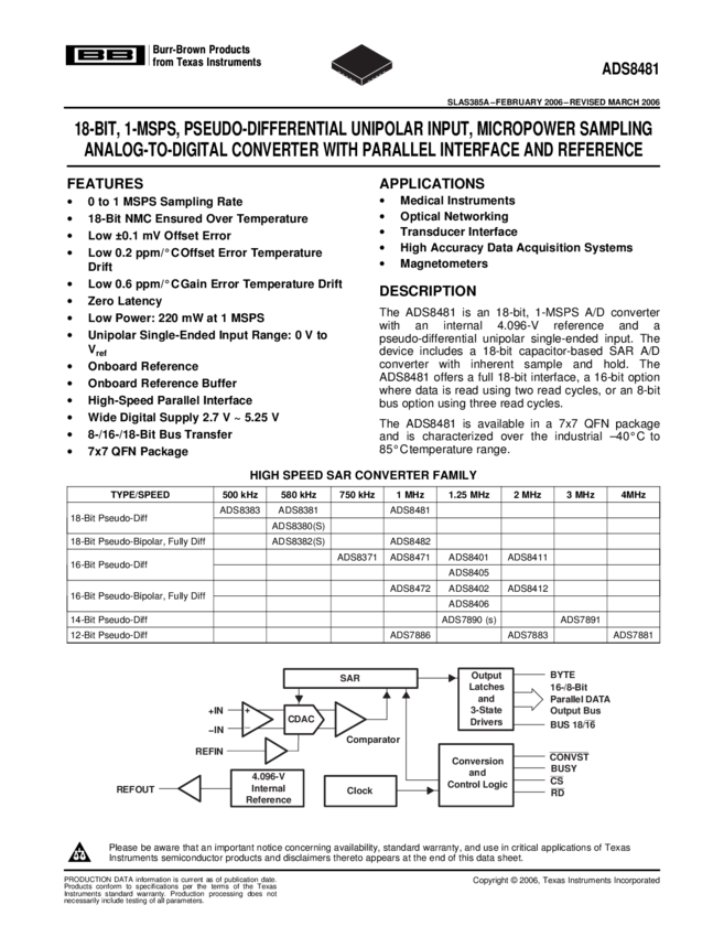 ADS8481IBRGZR ADC Single SAR 1Msps 18-bit Parallel 48-Pin VQFN EP T/R