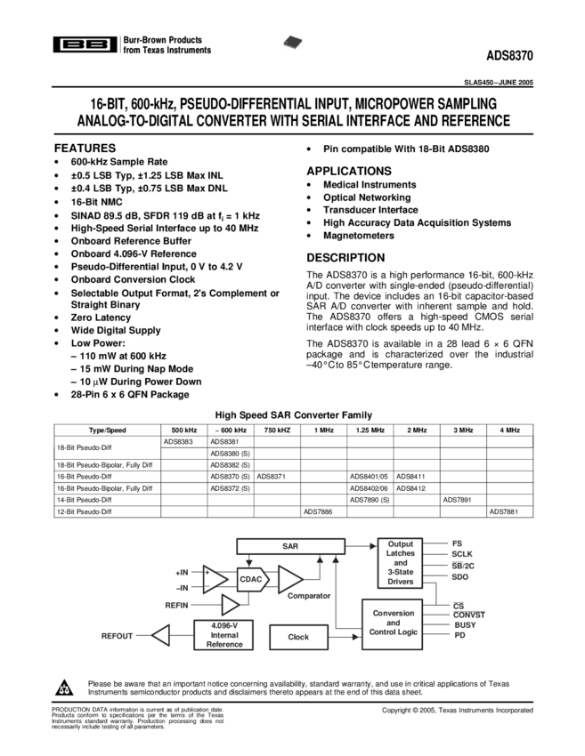 ADS8370IRHPR ADC Single SAR 600ksps 16-bit Serial 28-Pin VQFN EP T/R