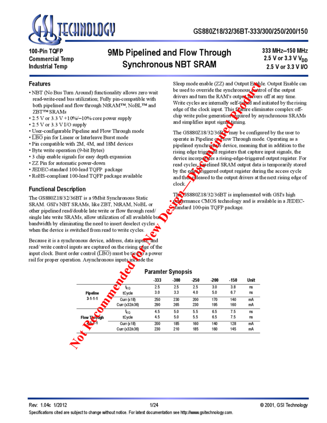 GS880Z36BGT-150I SRAM Chip Sync Quad 2.5V/3.3V 9M-Bit 256K x 36 7.5ns/3.8ns 100-Pin TQFP Tra...