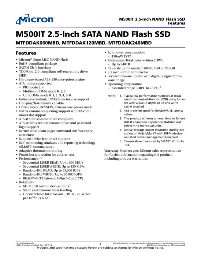 MTFDDAK240MBD-1AK12ITYY Solid State Drive SED/TCG 240 GB FLASH - NAND (MLC) 240TBW SATA-3.2 6 Gb/s