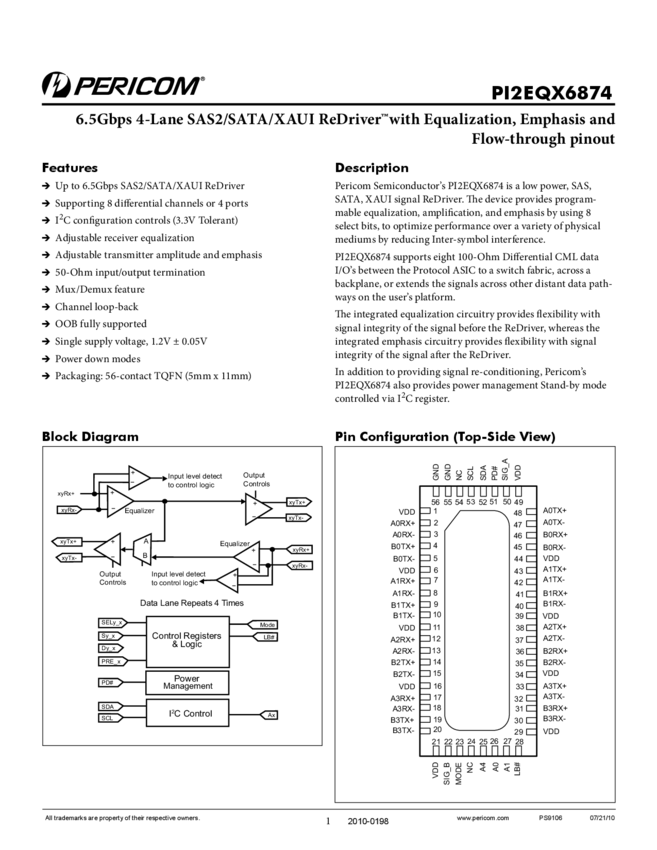 PI2EQX6874ZFE 6.5Gbps 4-Lane SAS2/SATA3/XAUI ReDriver 56-Pin TQFN Tray