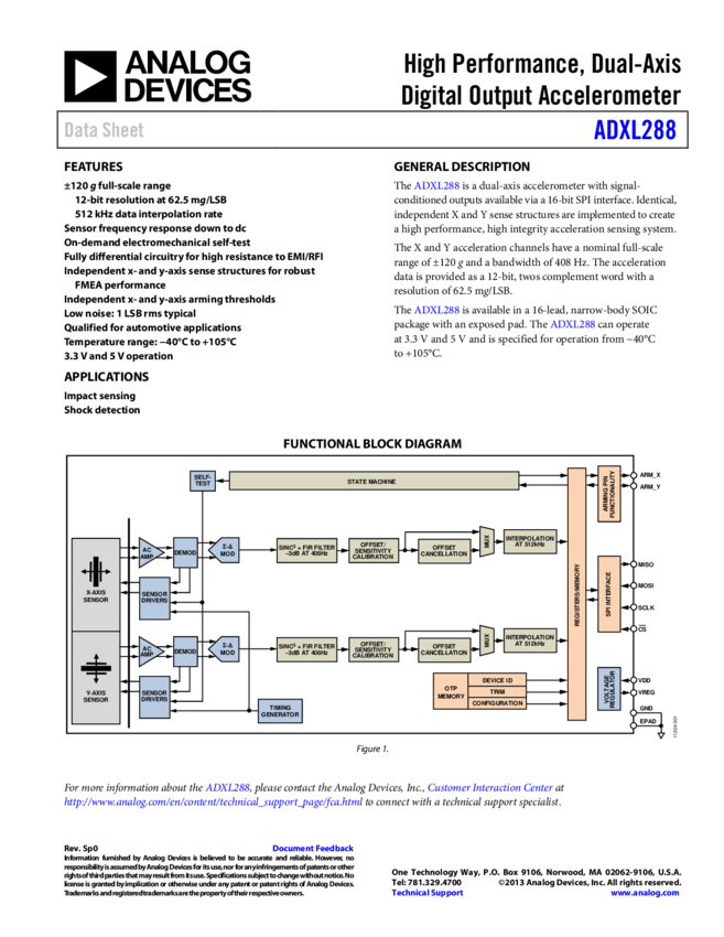 ADXL288 High Performance, Dual-Axis Digital Output Accelerometer
