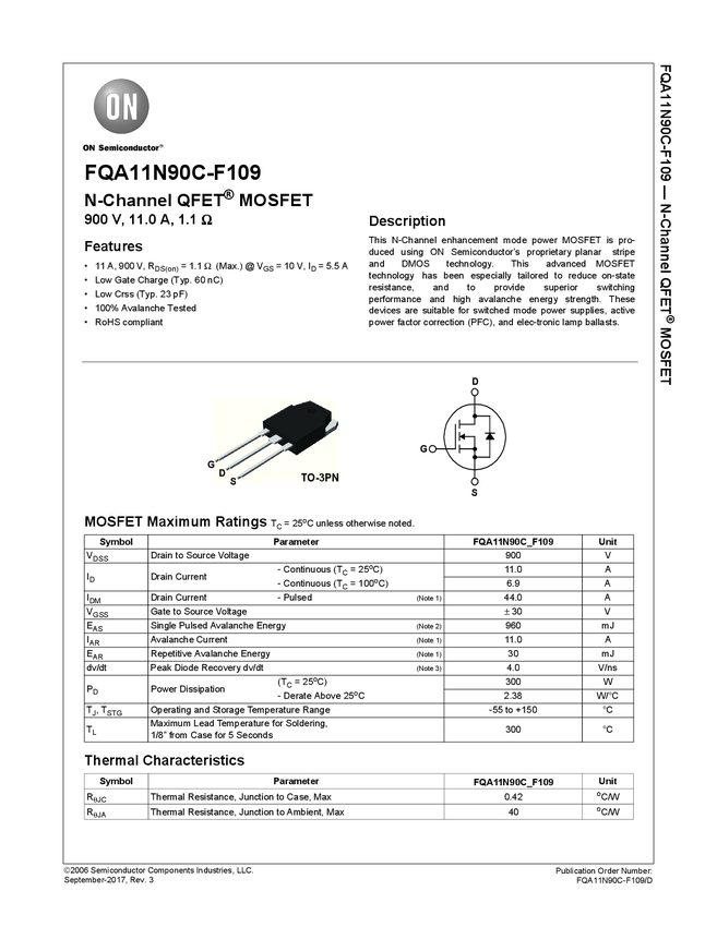 FQA11N90C_F109 N-Channel QFET® MOSFET 900V, 11.0A, 1.1Ω