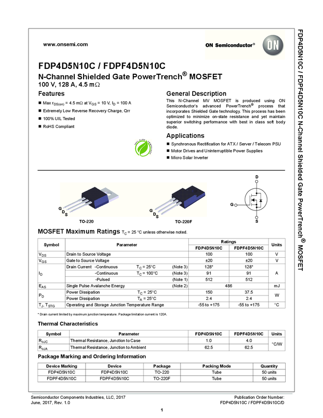 FDP4D5N10C N-Channel Shielded Gate PowerTrench® MOSFET, 100V, 128A, 4.5mΩ