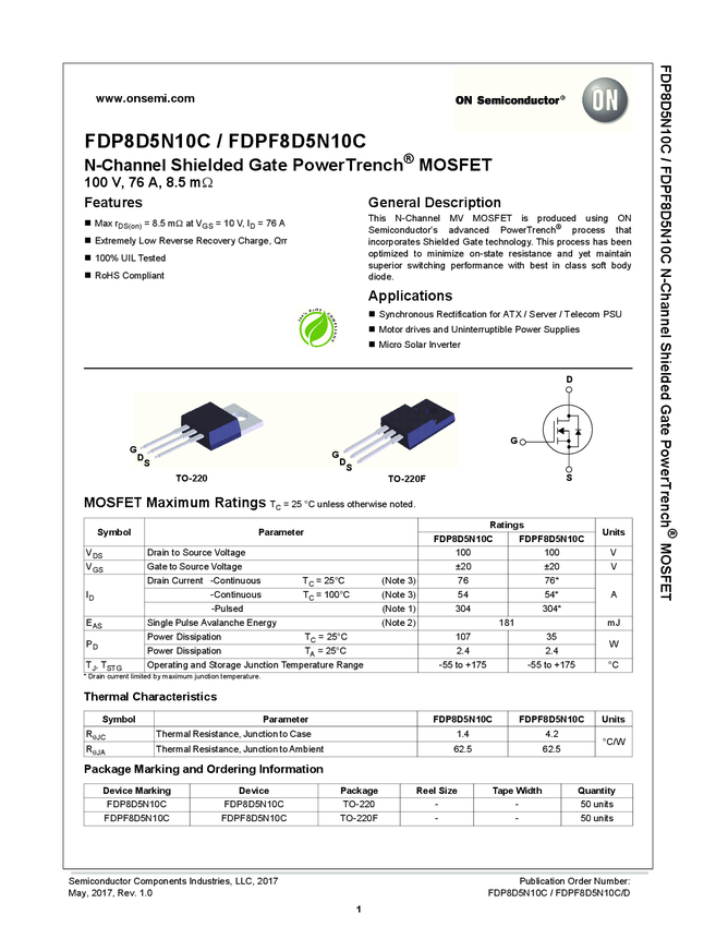 FDPF8D5N10C N-Channel Shielded Gate PowerTrench® MOSFET, 100V, 76A, 8.5mΩ