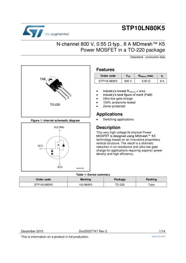 STP10LN80K5 N-channel 800 V, 0.55 Ohm typ., 8 A MDmesh K5 Power MOSFET in a TO-220 pack...