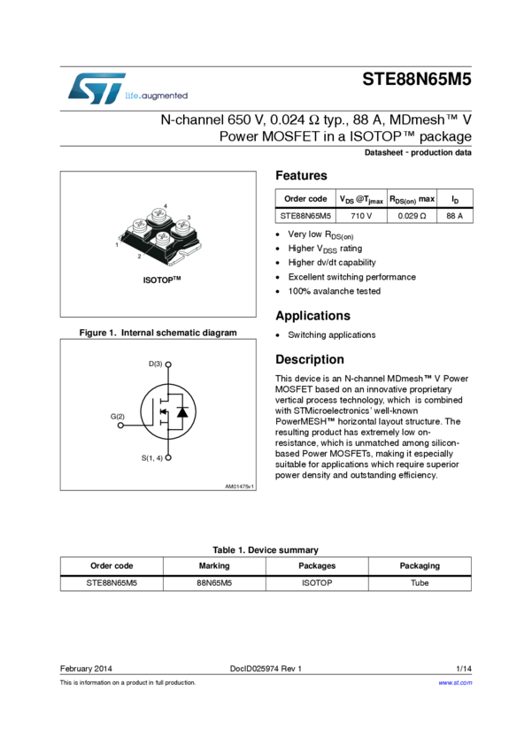 STE88N65M5 N-channel 650 V, 0.024 Ohm typ., 88 A MDmesh M5 Power MOSFET in a ISOTOP pa...