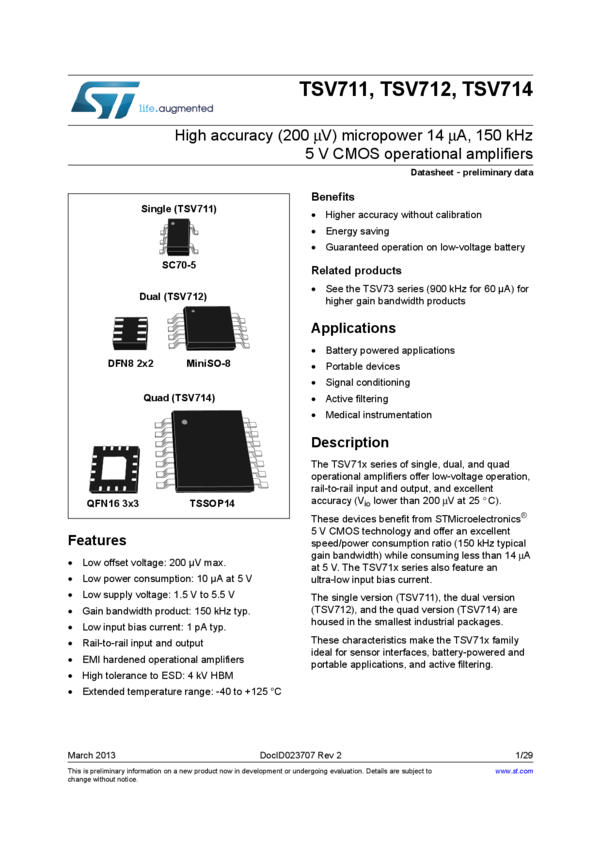TSV711 High accuracy (Vio below 200uV) Micropower (10uA) 5V CMOS Op Amp, single, G...