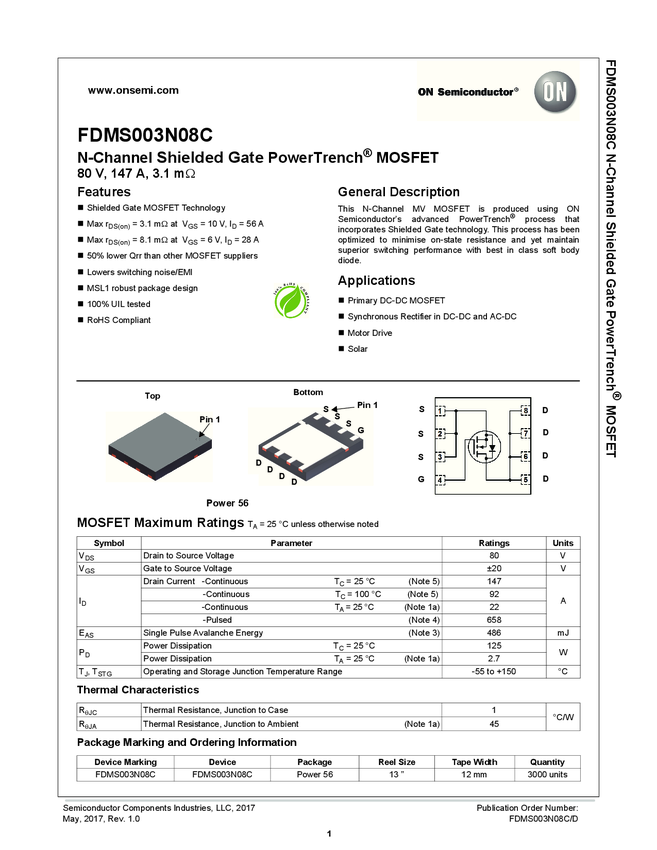 FDMS003N08C Power MOSFET 80V, 147A, 3.1mOhm , Single N-channel,Power56, Std. gate