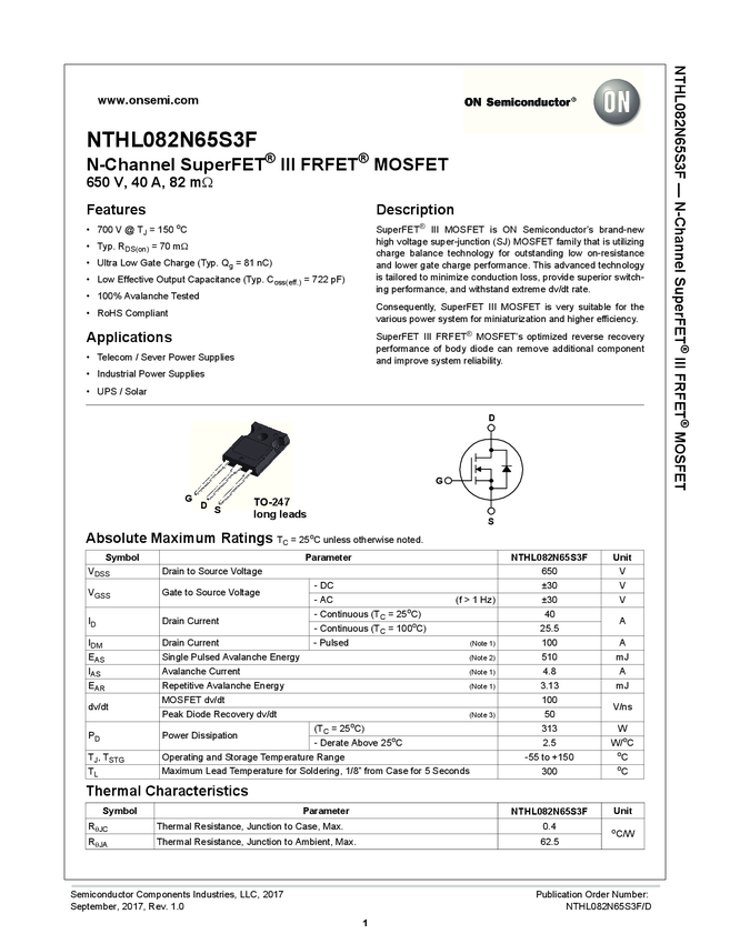 NTHL082N65S3F N-Channel SuperFET® III FRFET® MOSFET 650 V, 40 A, 82 mΩ, TO-247