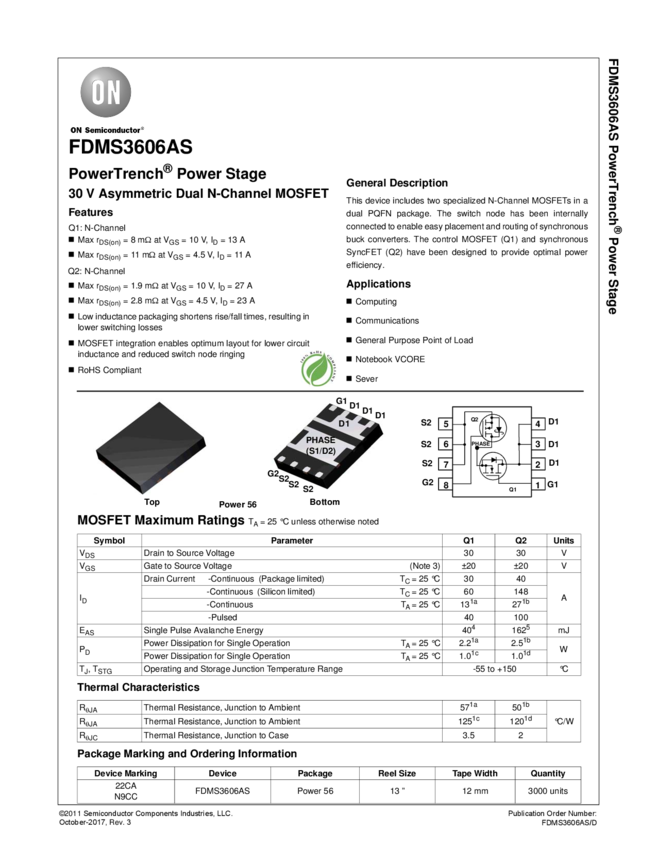 FDMS3606AS 30V Asymmetric Dual N-Channel MOSFET, PowerTrench® Power Stage